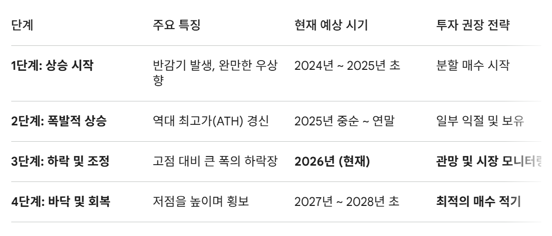 이미지 속 논리에 따르면 2026년은 '제3단계 : 하락 및 조정기'에 해당합니다. 2025년에 기록적인 고점을 찍었다면, 올해는 그 거품이 빠지며 바닥을 확인하러 가는 시기인 셈이죠.