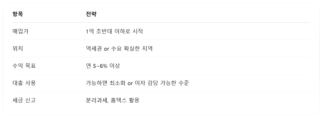 💡 참고: 전세보다 월세가 유리한 이유는 현금 흐름이 꾸준히 들어오기 때문입니다. 전세는 목돈으로 묶이지만 월세는 매달 입금이 되니까 생활비, 병원비 등으로 유동자금 활용이 가능하죠.
